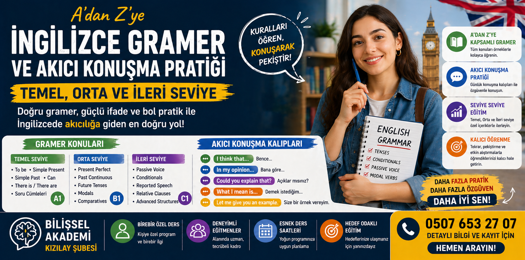 İngilizce grameri ezberleyerek vakit kaybetmek yerine, anlayarak öğrenmek ve akıcı konuşma becerinizi zirveye taşımak için Bilişsel Akademi Kızılay ile hemen başlayın!